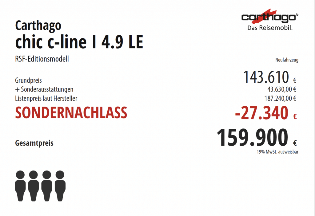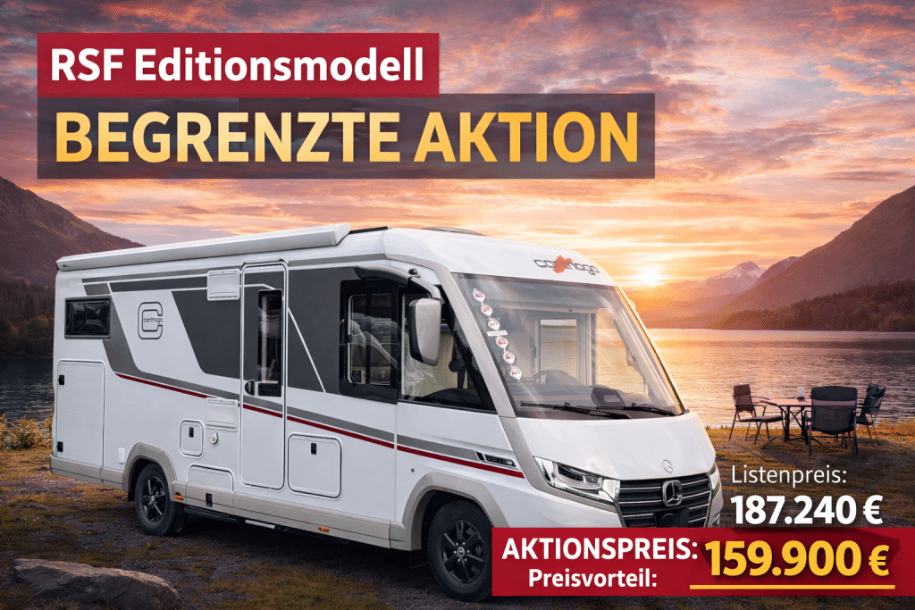 Ein Editionsmodell des Carthago chic c-line I 4.9 LE auf Mercedes-Benz, als limitierte Aktion im aktuellen Modelljahr 2026. Sie bekommen ein attraktiv geschnürtes, hochwertiges Gesamtpaket mit dem Top-Grundriss, nahezu voll ausgestattet und als fertig durchdachtes Paket mit klarem Preisvorteil. Der Listenpreis liegt bei 187.240 Euro, wir bieten dieses RSF-Editionsmodell zum Aktionspreis von 159.900 Euro an. Wichtig: Diese Edition ist nur in begrenzter Stückzahl verfügbar!